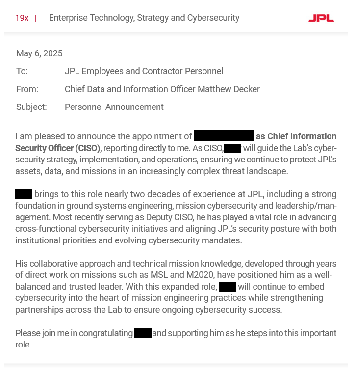 When key leadership roles shifted at NASA’s Jet Propulsion Laboratory, more than 10,000 employees, contractors, and partners needed more than just an announcement—they needed a story that brought clarity, reassurance, and momentum. Partnering directly with JPL’s executive leaders, I crafted and delivered enterprise-wide communications that did more than share titles—they built trust. By applying change management strategies and a deep understanding of employee sentiment, we ensured that these transitions felt less like disruptions and more like evolution. The result? Confident teams, informed partners, and a clear path forward.